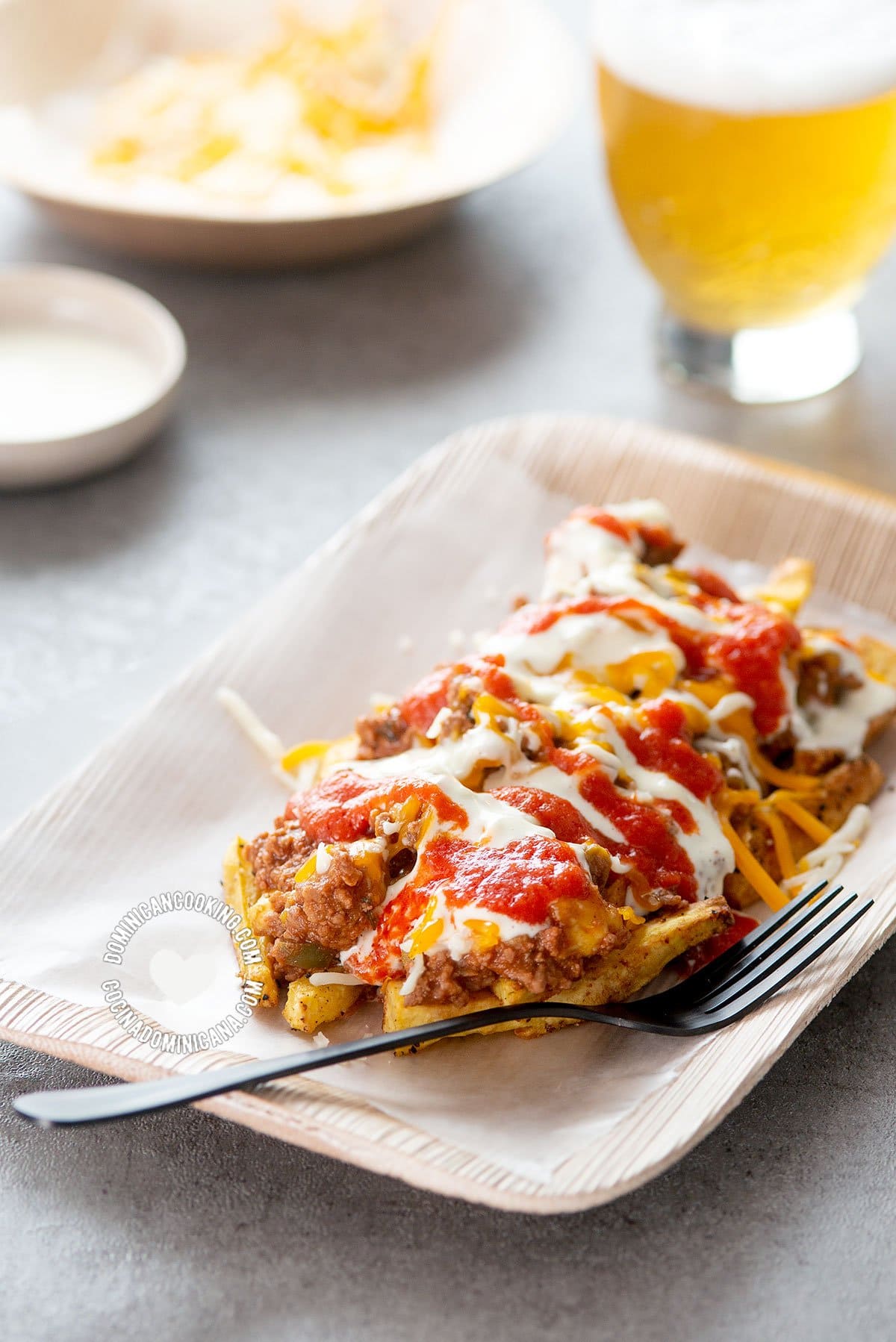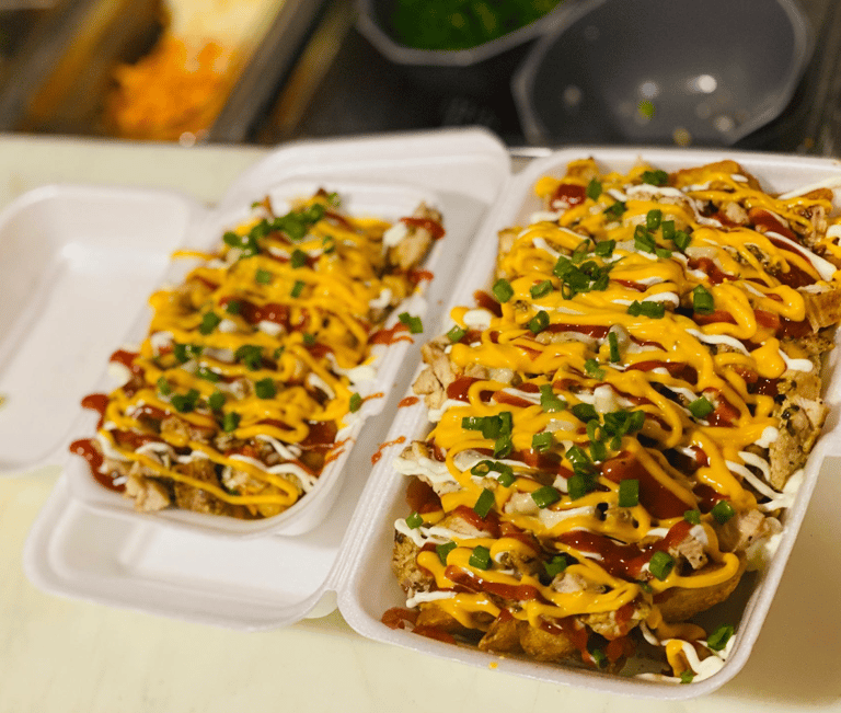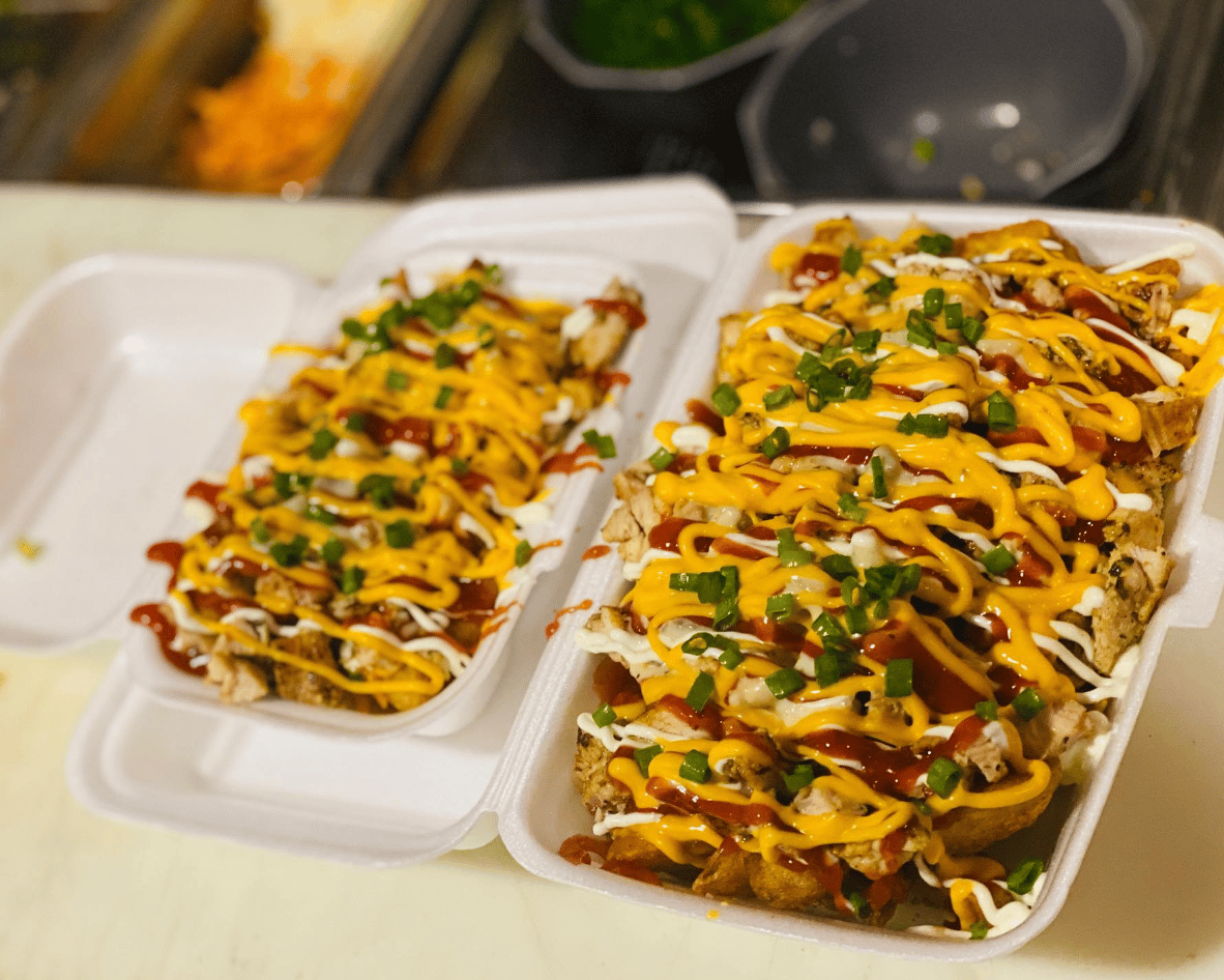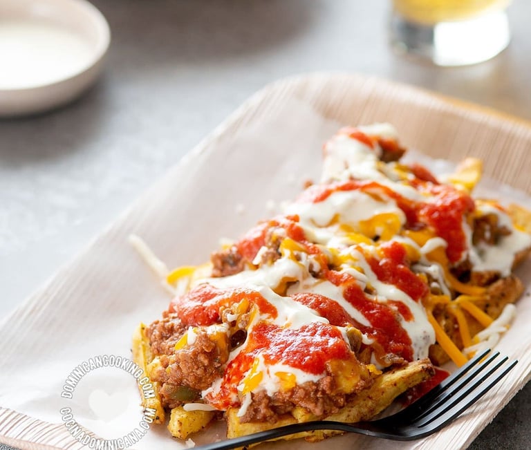Cama de papas, con carne de res, pechuga de pollo, cubiertas de ketchup, mayonesa, queso fundido y bacon.