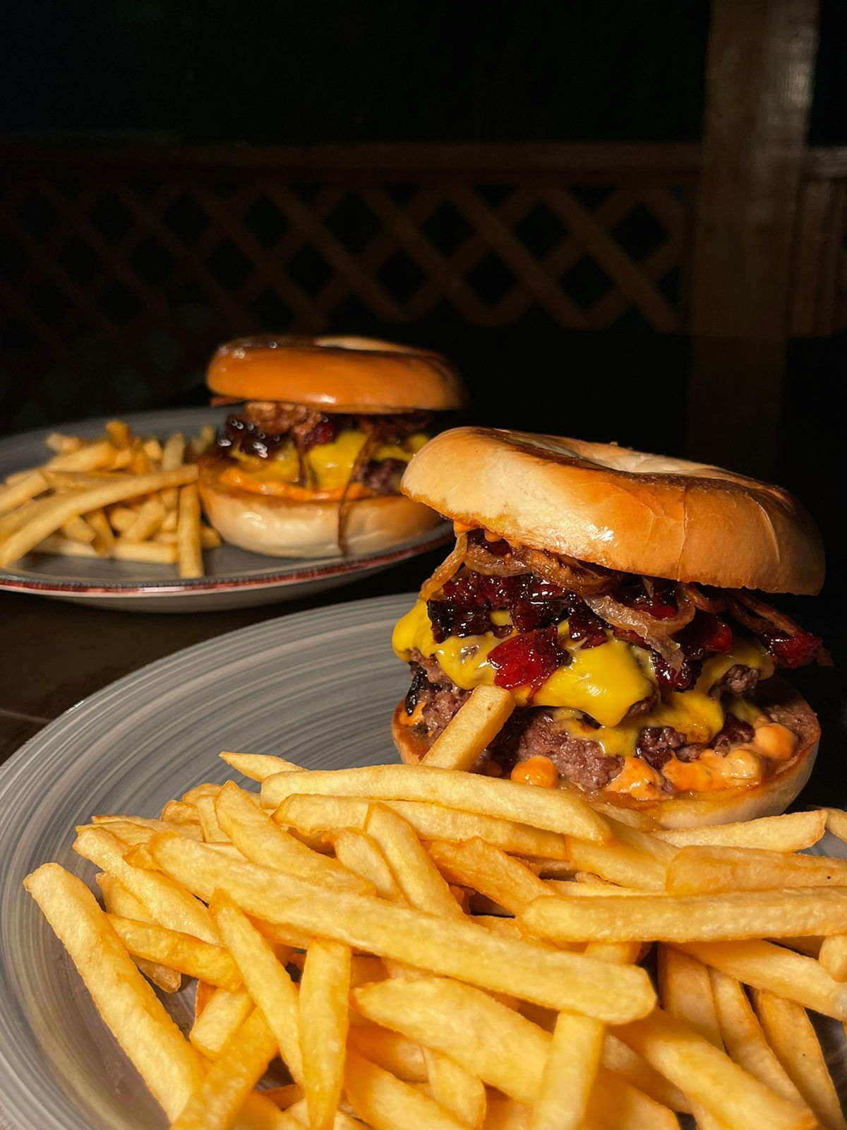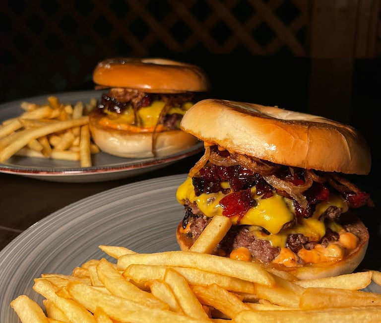 Pan bagel, doble carne smash, doble queso americano, aros de cebolla, mermelada de bacon.