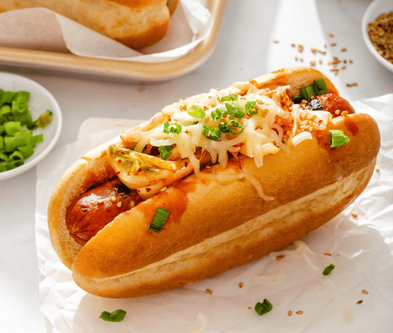 Pan artesanal, salchicha emilios, ketchup, mayonesa, queso fundido y mostaza.